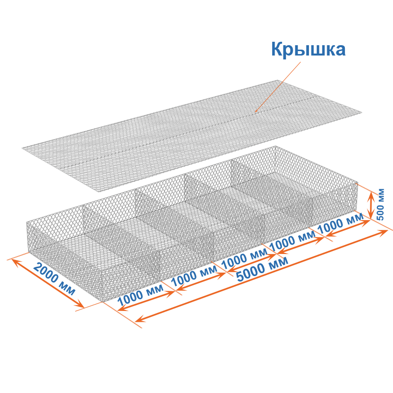 Габионные матрасы Рено 5х2х0,5: ячейка 60х80, диаметр проволоки 2,2 мм, покрытие Цинк.